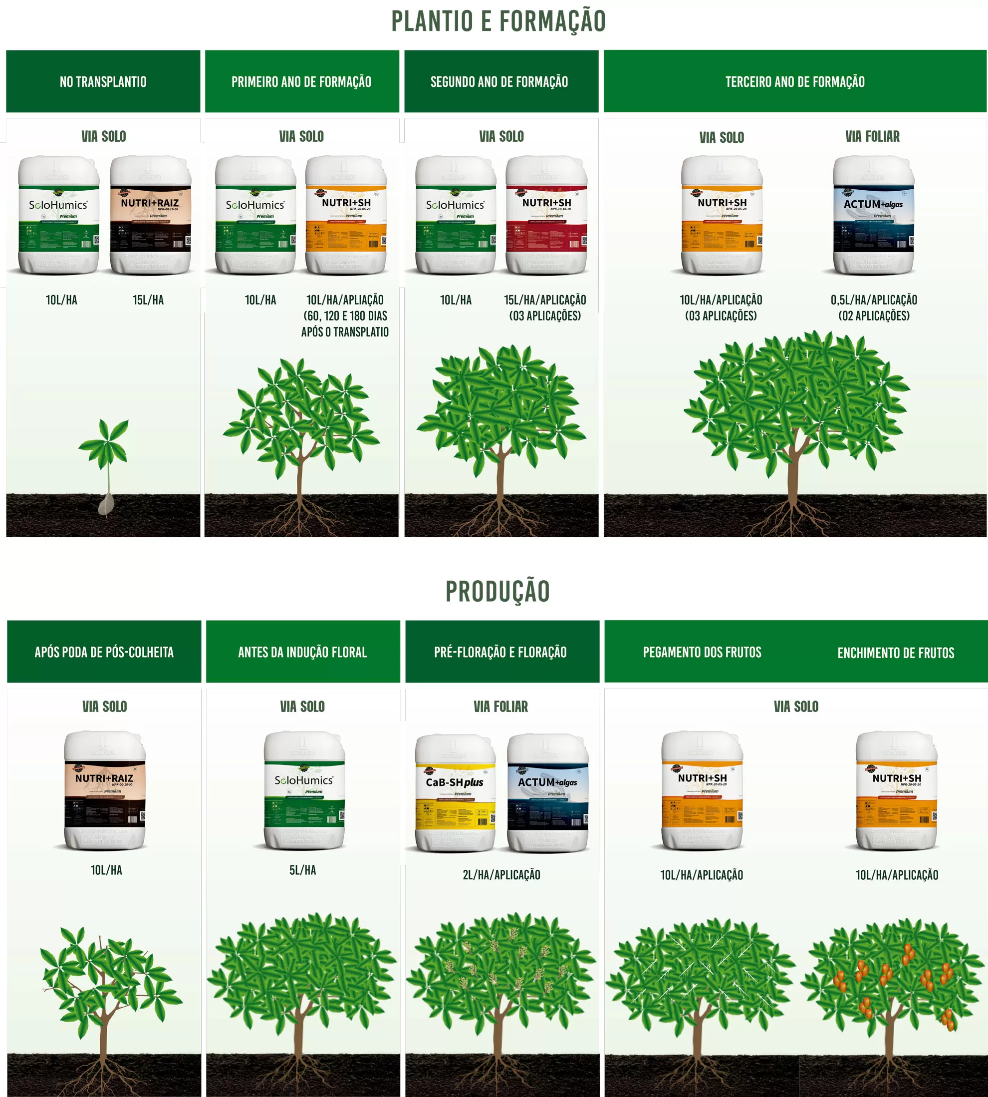Aplicar o produto FÚLVICO-SH_Plus juntamente com defensivos na dosagem de 2L/ha.