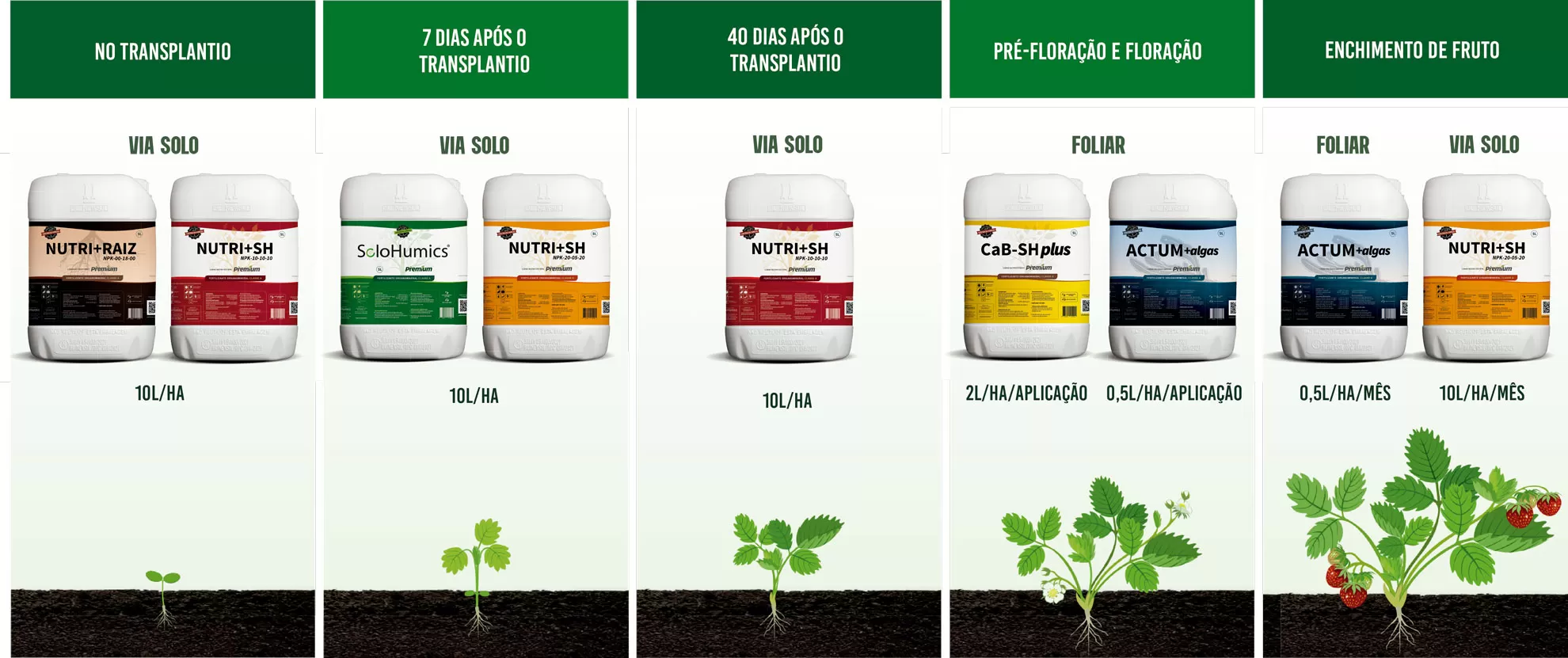 Aplicar o produto FÚLVICO-SH_Plus juntamente com defensivos na dosagem de 2L/ha.